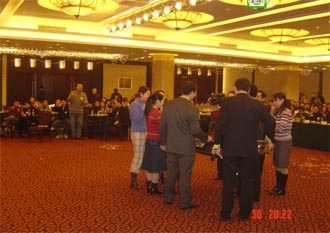 “创新,至诚,兄弟,浩气”四个团队的建立,从传统文化中衍生出现代的价值观,也展现了本次联谊会的主题“团队,真诚,友谊”。热烈的游戏“第一桶金”,拉开了晚会的序幕,也带来了2006的好彩头。一首吉他弹唱《SAILING》,轻快悦耳,一曲《我属于中国》,澎湃激昂:而男女对唱《你最珍贵》,独唱《风往北吹》,深情款款,优美动听,不时激起阵阵雷鸣般的掌声,也反映了重大MBA学子们的绚丽风采。精彩的魔术表演,深情的诗朗诵《老人与海》,幽默诙谐的小品《大四男生》,淋漓尽致地展现了MBA同学们的多才多艺和创新性。而特邀嘉宾重庆市著名笑星、著名方言艺术家吴文老师的表演,更是让大家开怀大笑,乐不可之,让大家在欢声笑语中感受2006春的暖意:另一位特邀嘉宾著名川剧表演艺术家陆小路的《变脸》表演,亦梦亦幻,把晚会带入另一个高潮。在晚会游戏“快乐传真”和“七拼八凑”中,MBA同学们表现出超强的理解力,表现力和配合精神,出色地完成了任务。同时,在节目中还穿插了多次的抽奖活动,通过送出一次次奖品,也送出了对所有来宾深深地祝福和感谢。