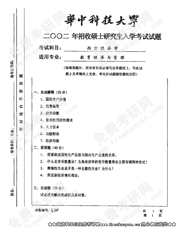 华中科技大学2002年硕士研究生入学考试西方经济学