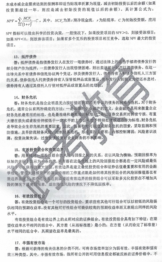 1.名词解释3*6 有效前沿 金融衍生工具 速动比率 利率期限结构 2.简答题10*4 (1)互换的功能是什么? (2)如果让你用500元换30年后的10000你是否愿意?承诺兑付的人对你的决定是否有影响? (3)什么是可转换债券?什么是可赎回债券?二者在同样情况下哪个利率更高? (4)杜邦分析法,怎么提高权益收益率 ...