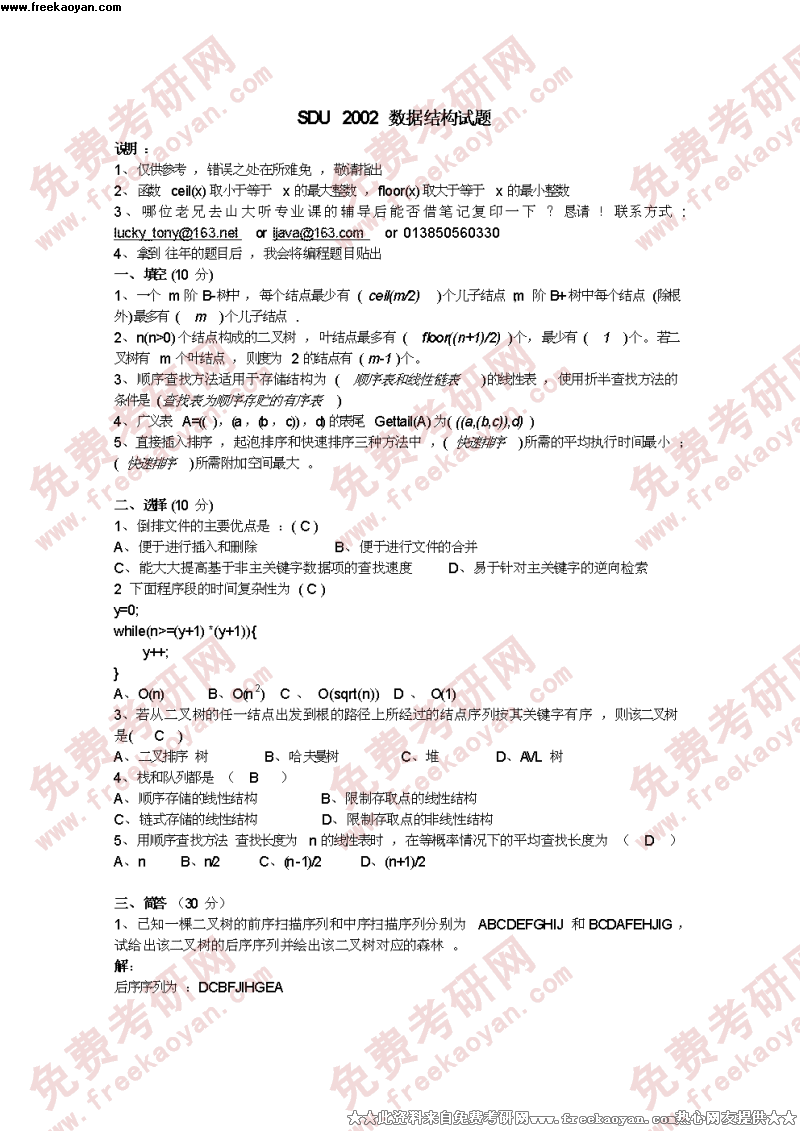 专业课考研经验 本站小编 FreeKaoyan 2018-01-22一、填空1、“子曰:学而时习之,不亦说乎!(有朋自远方来,不亦乐乎!)人不知而不愠,不亦君子乎!”2、《汉书·艺文志》以“(缘事而发)”的概括准确指出了汉乐府诗歌强烈的现实性3、以《咏史》组诗奠定其在文学史上地位的六朝诗人是(左思)4、庾信《寄王琳》诗云:“(玉关道路远 ),(金陵信使疏)。独下千行 ...