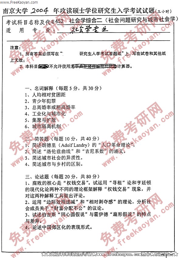 南京大学2004年考研真题-社会学综合考试一二
