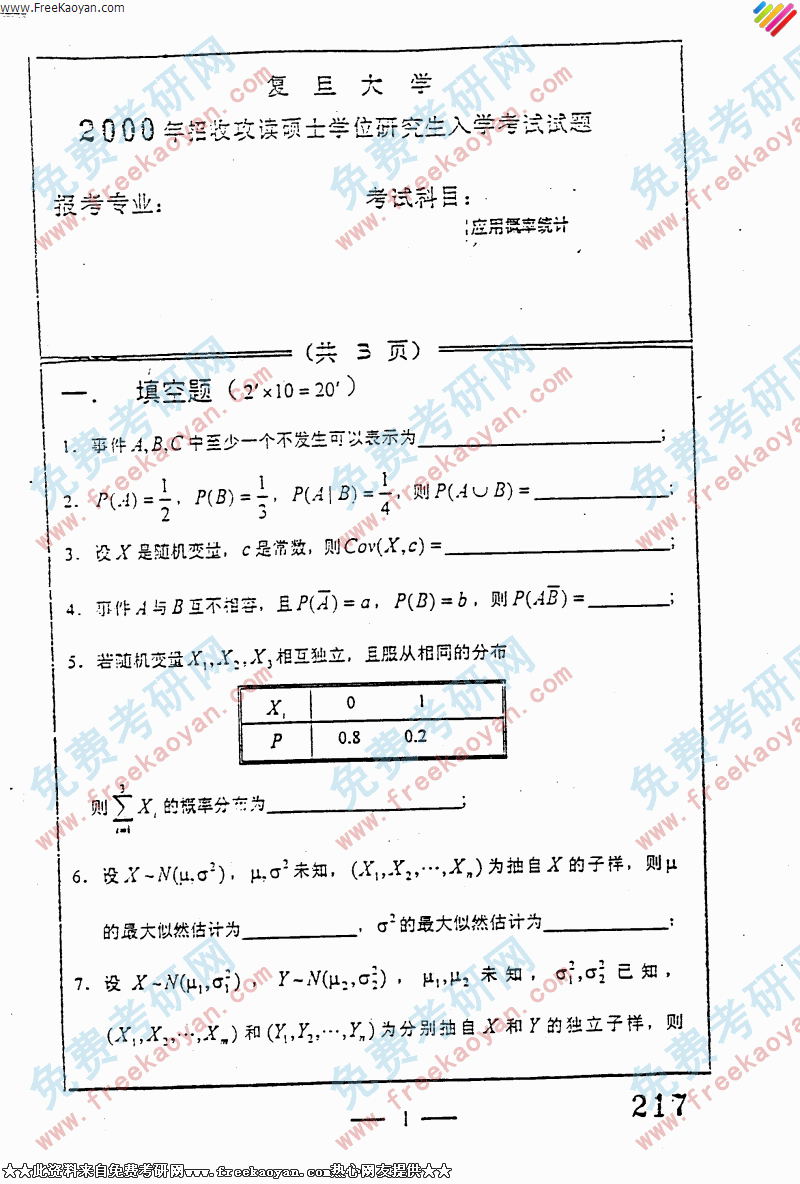 复旦大学2000年考研真题-应用概率统计