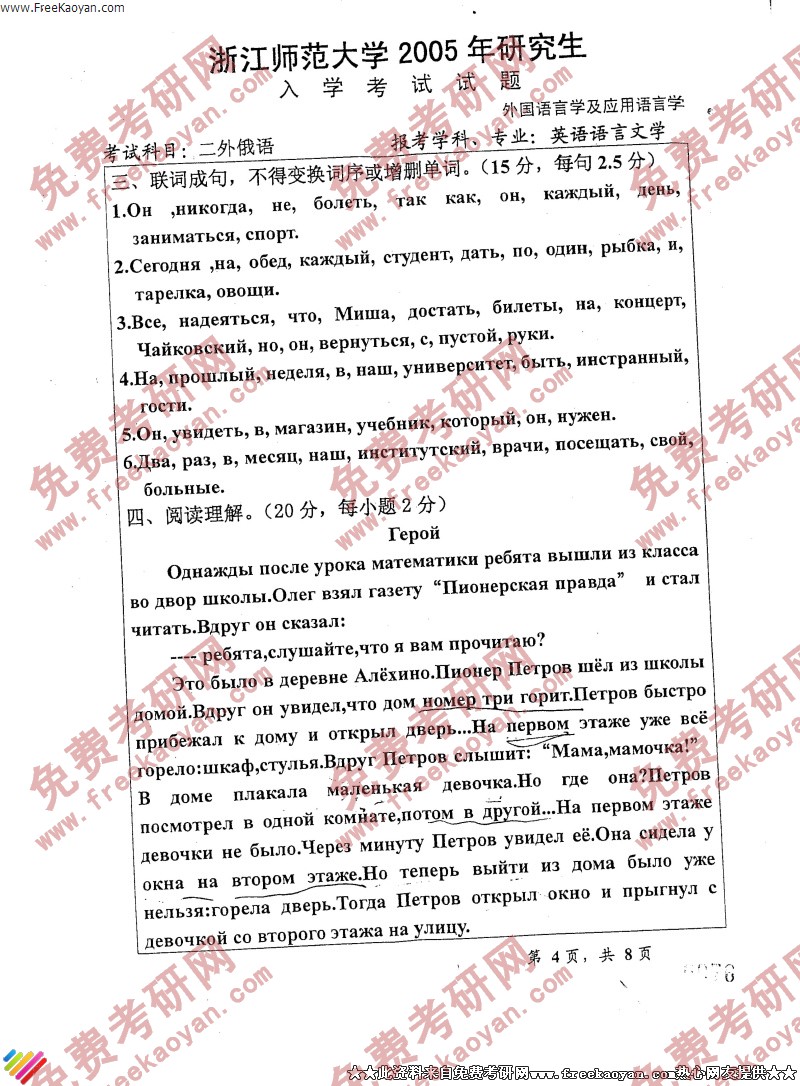 浙江师范大学2005年考研真题-二外俄语(4)