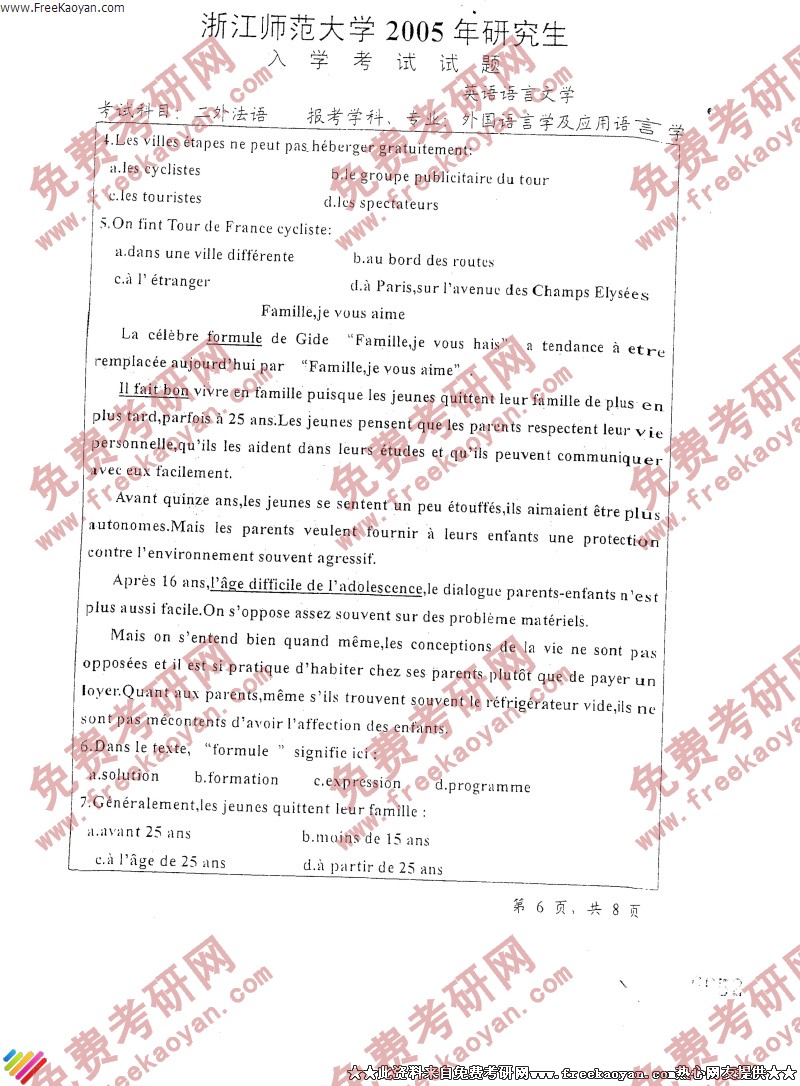 浙江师范大学2005年考研真题-二外法语(6)