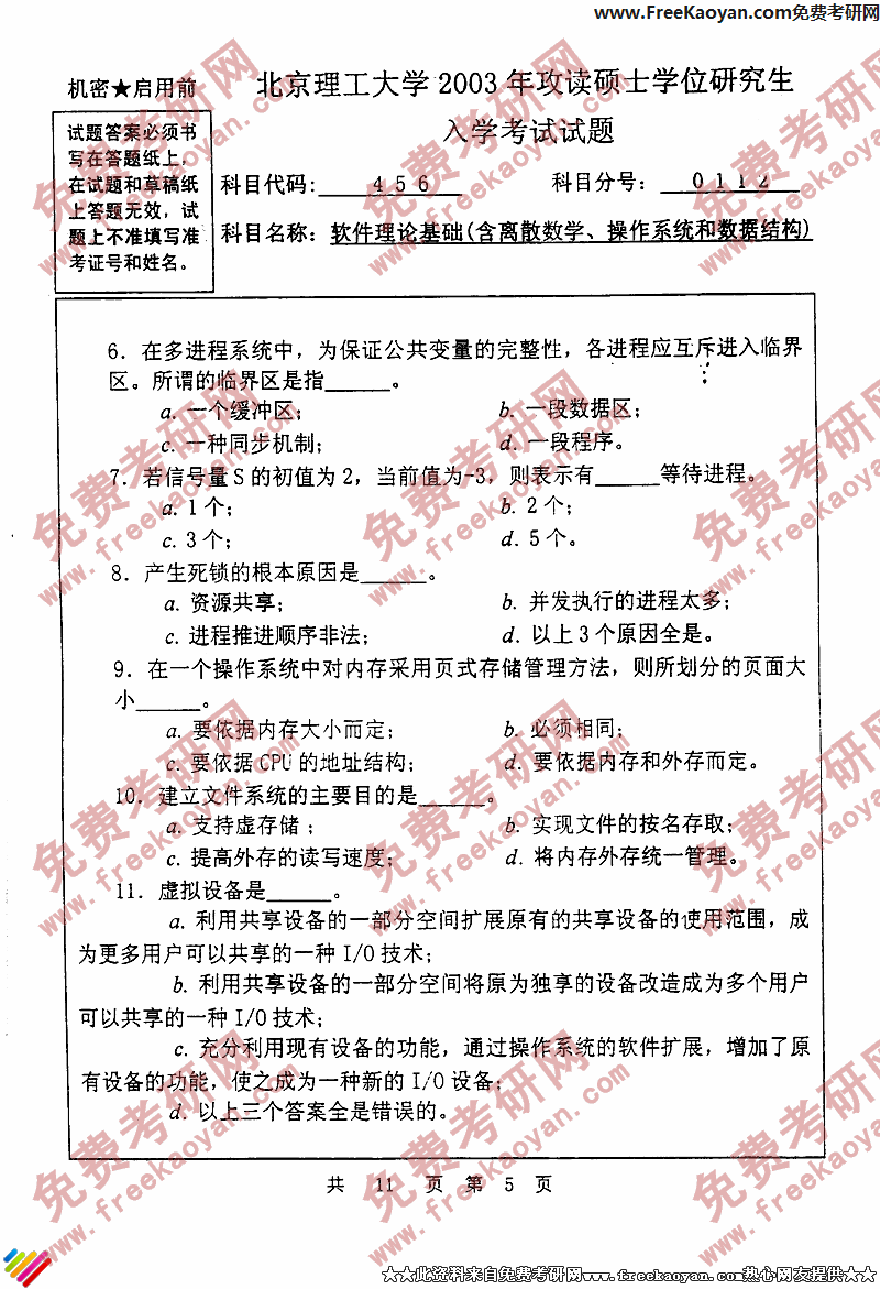 专业课考研经验 本站小编 FreeKaoyan 2018-01-22北京理工大学2003年考研真题-计算机技术基础(含计算机组成原理、操作系统和数据结构)