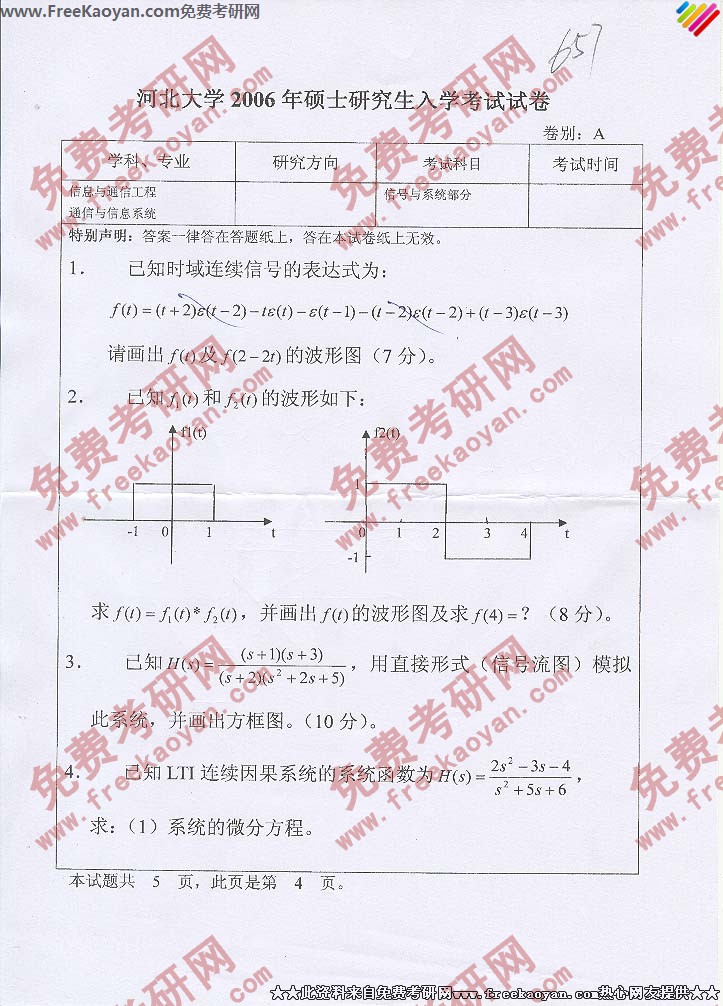 河北大学2006年考研真题-信号与系统通信原理(4)