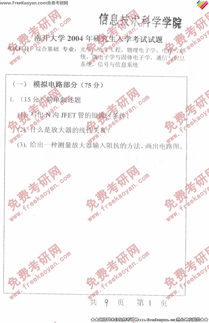 专业课考研经验 本站小编 FreeKaoyan 2018-01-23南开大学2003年考研真题-信息技术科学学院综合基础课