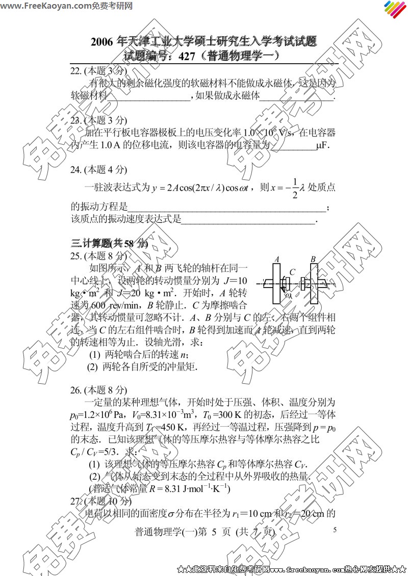天津工业大学2006年考研真题-普通物理学一(427)(5)