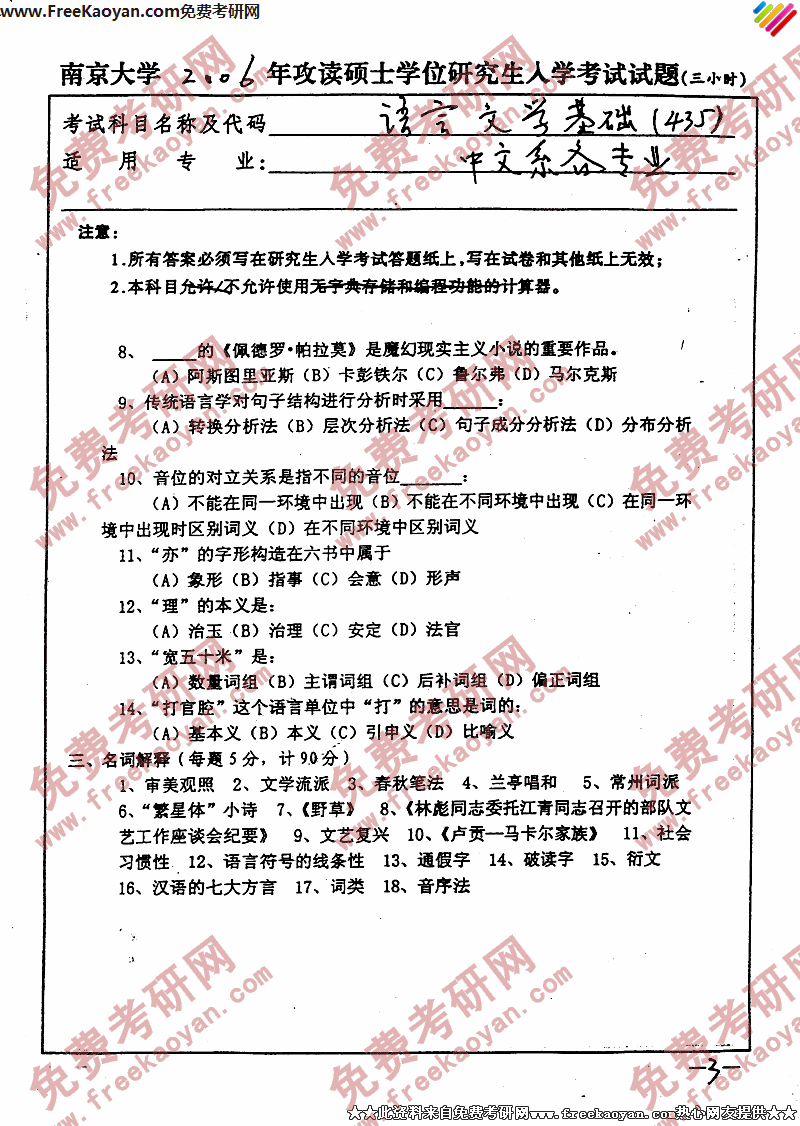 专业课考研经验 本站小编 FreeKaoyan 2018-01-23南京大学2006年考研真题-汉语