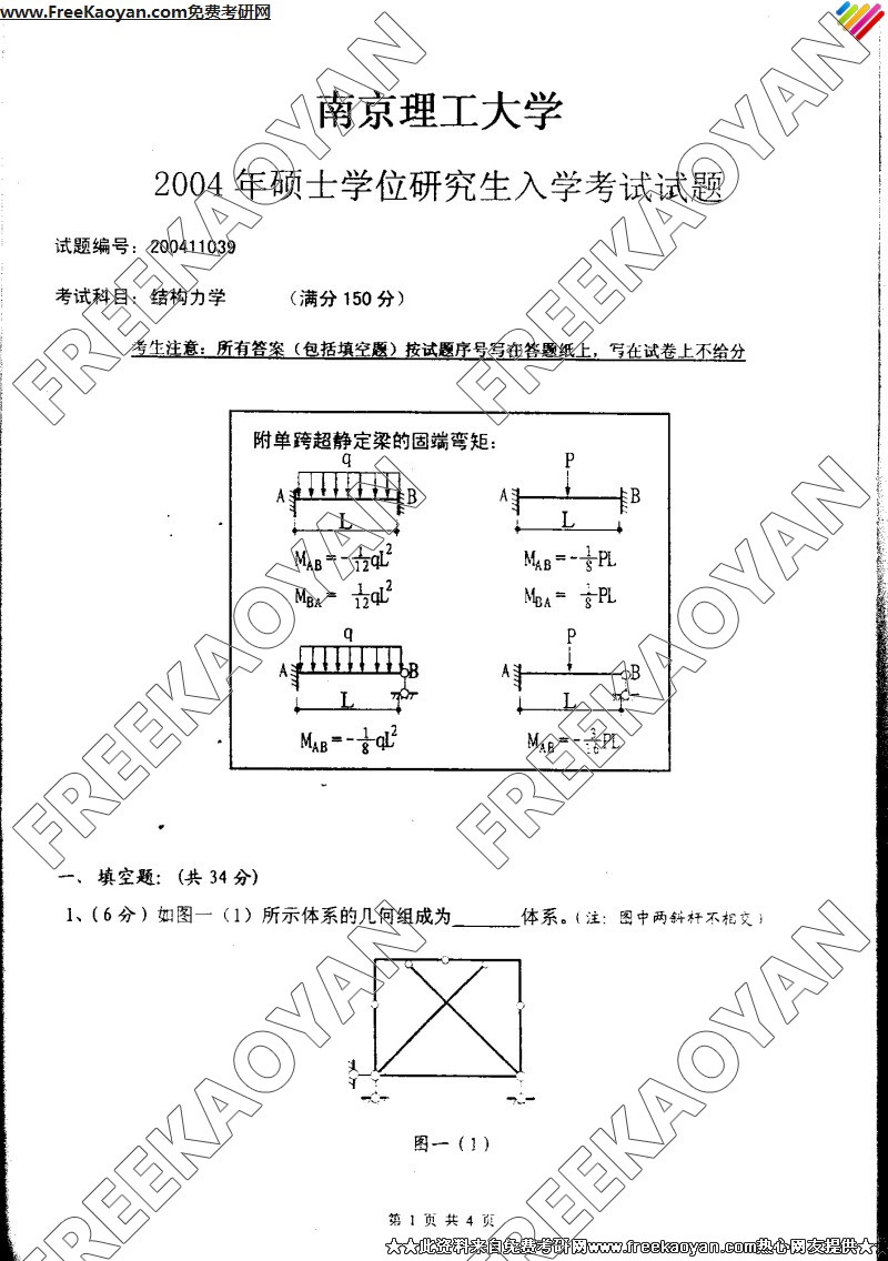 专业课考研经验 本站小编 FreeKaoyan 2018-01-23南京理工大学2004年考研真题-工程力学(B)