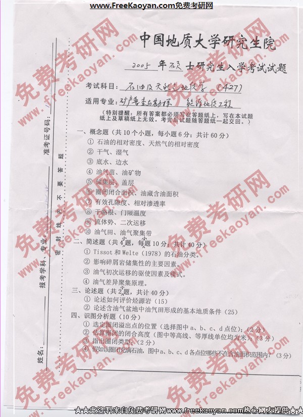相关话题/石油 考研真题 中国地质大学 天然气 地质学