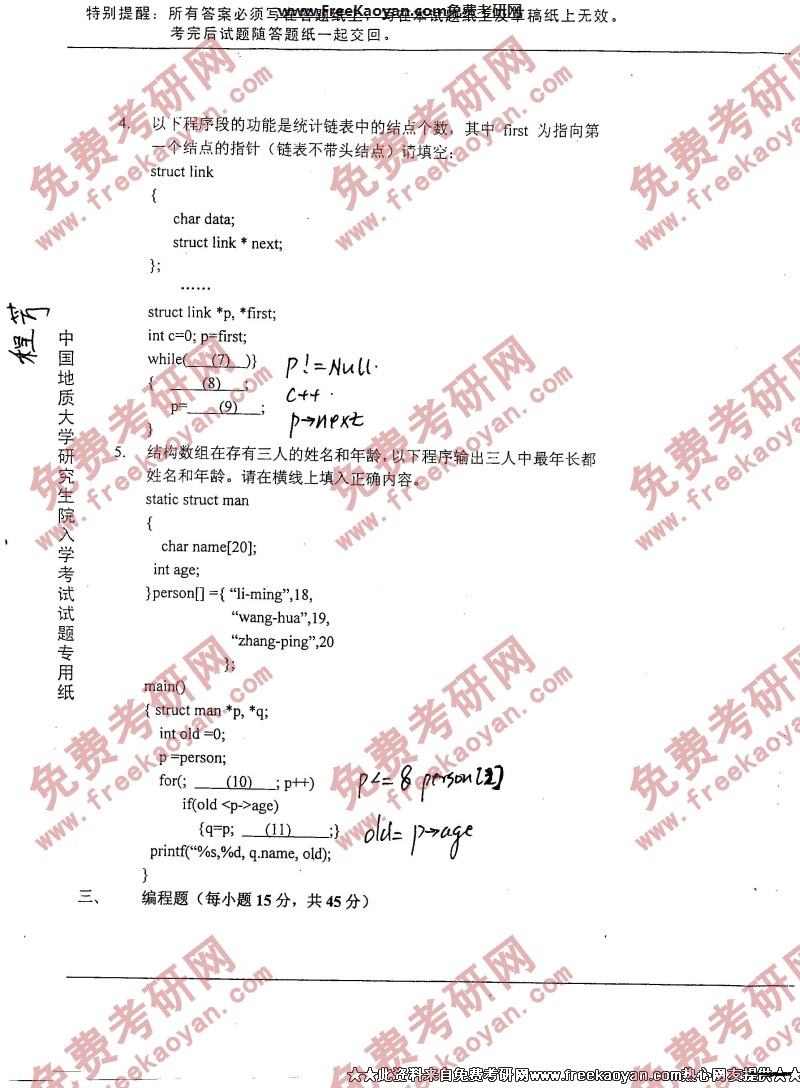 专业课考研经验 本站小编 FreeKaoyan 2018-01-23中国地质大学(武汉)2006年考研真题-C语言