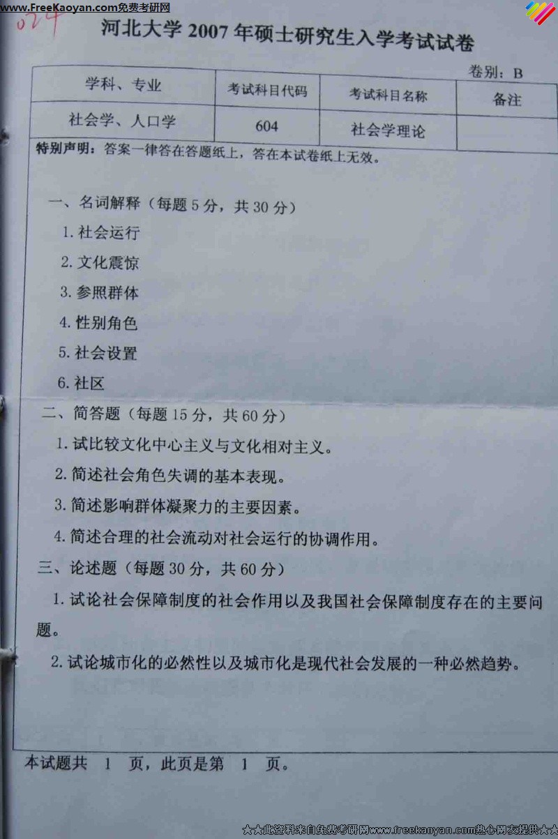 专业课考研经验 本站小编 FreeKaoyan 2018-01-23河北大学2007年考研真题-人口学
