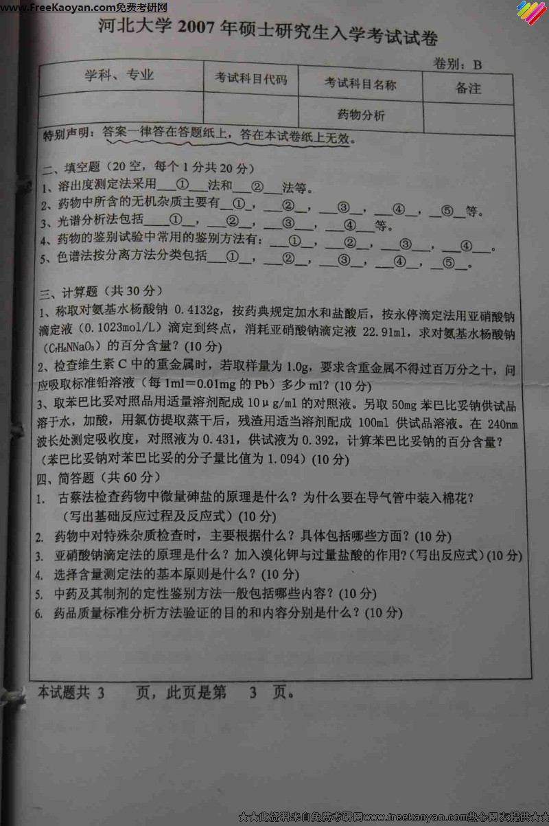 专业课考研经验 本站小编 FreeKaoyan 2018-01-23河北大学2007年考研真题-无机化学