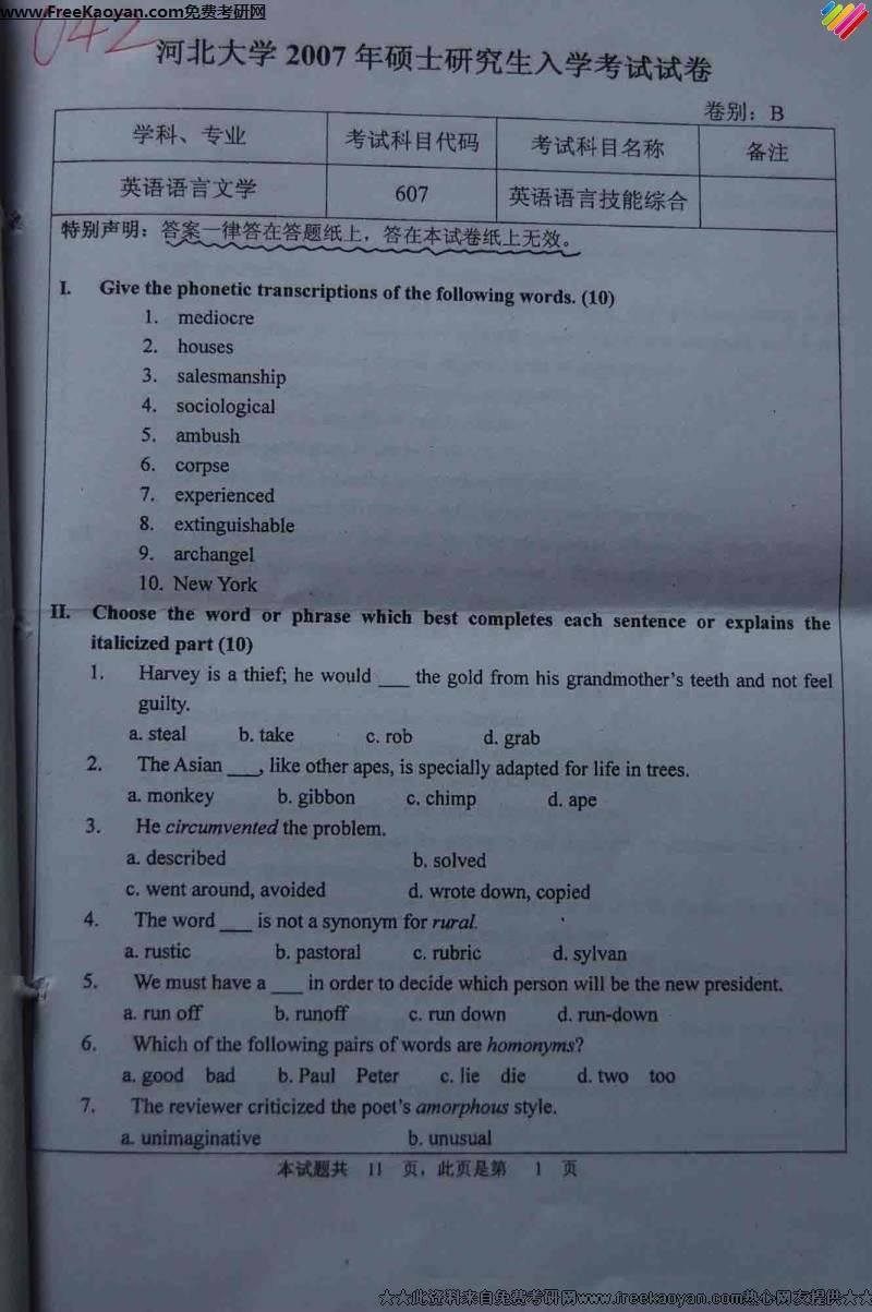 相关话题/英语 考研真题 河北大学 综合 语言