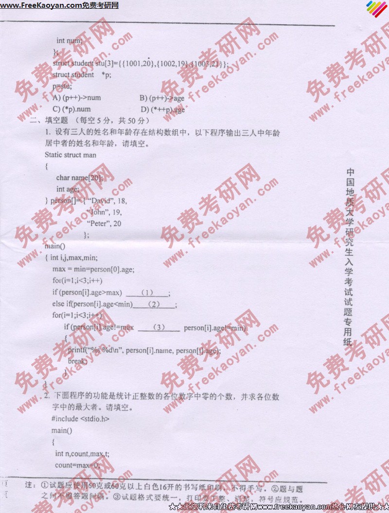 专业课考研经验 本站小编 FreeKaoyan 2018-01-23中国地质大学(武汉)2007年考研真题-C语言