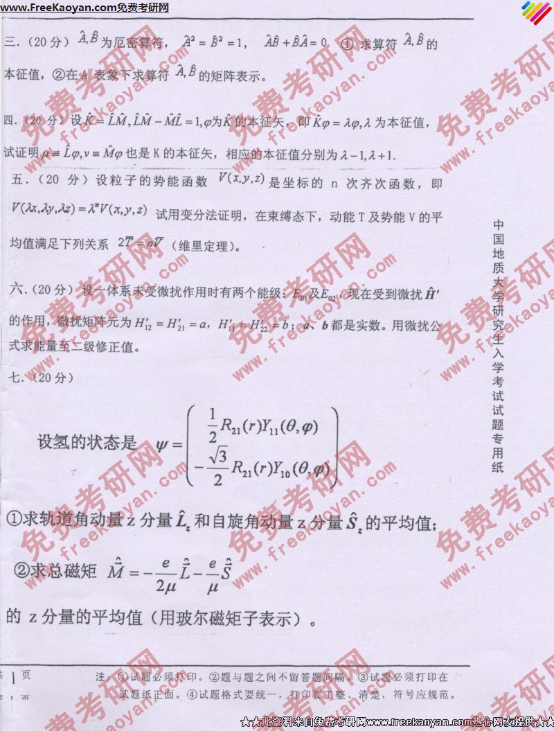 中国地质大学(武汉)2007年考研真题-量子力学(2)