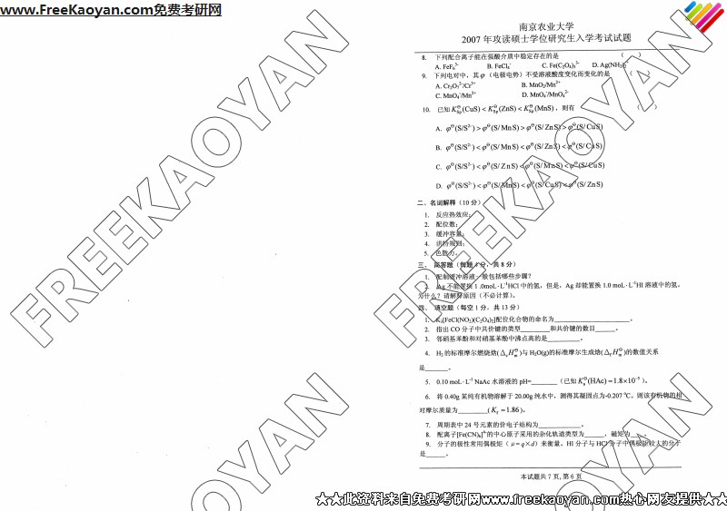 南京农业大学2007年考研真题-化学(6)