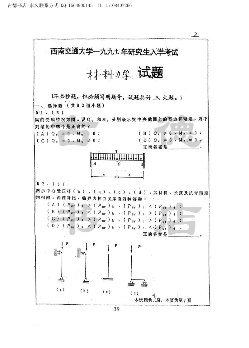 西南交通大学1986-1999年材料力学考研真题(50)