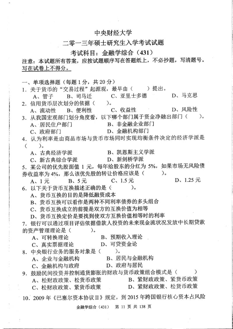 中央财经大学2015-2011金融学综合431考研真题(10)