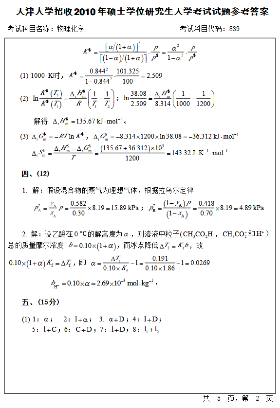 • 天津大学2003年《物理化学》考研真题答案(版本1)