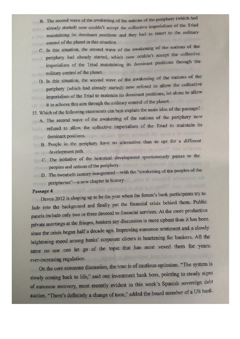 历年真题 2017年中国人民大学博士研究生入学考试英语试题 Part Ⅱ Reading Comprehension (40 %) Directions: There are 4 reading passages in this part. Each passage is followed by some questions or unfinished statements. For each of them there are four choices marked A, B, C and D.You should decide ...