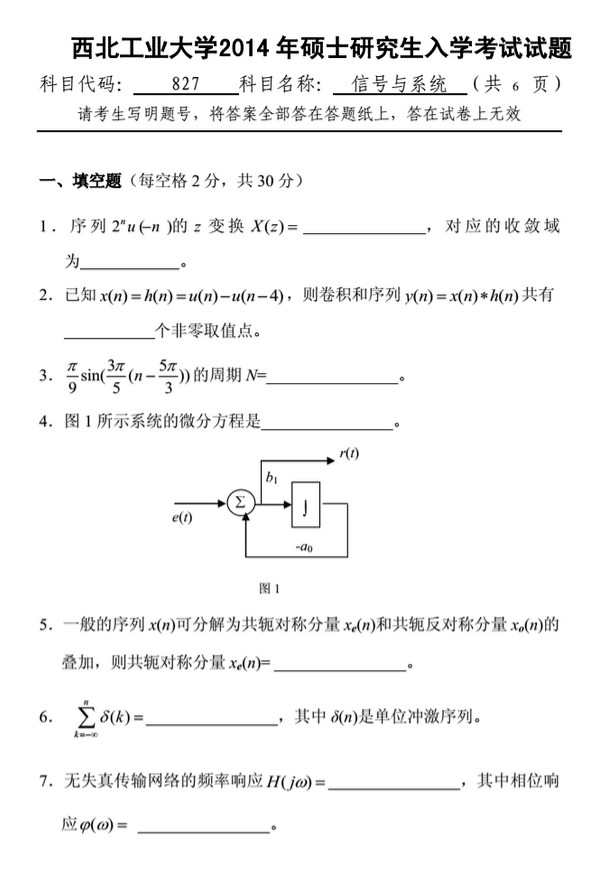 2011-2015年西北工业大学827信号与系统考研真题(6)