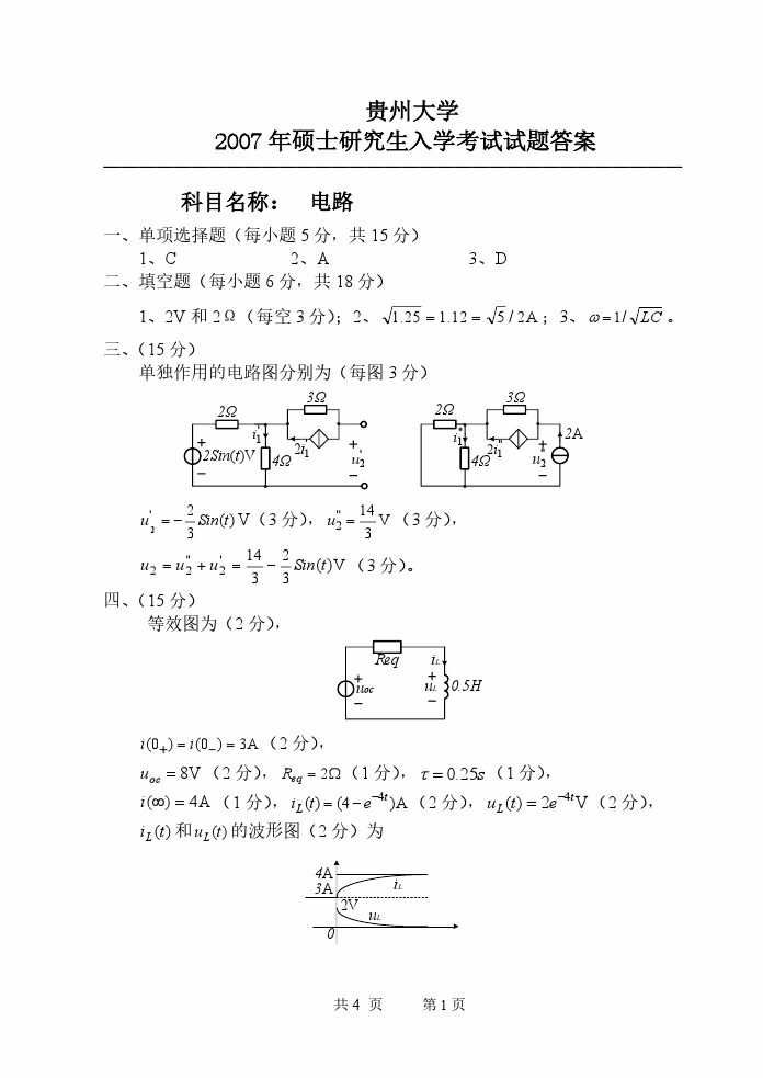 2000-2014年贵州大学电路考研真题与答案解析(43)