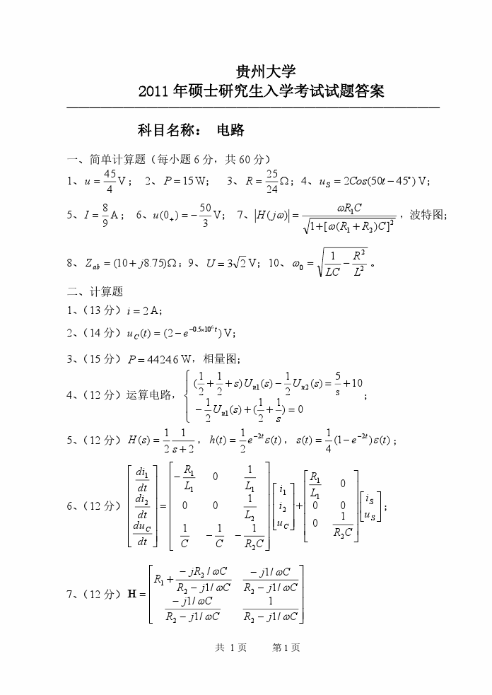 2000-2014年贵州大学电路考研真题与答案解析(51)