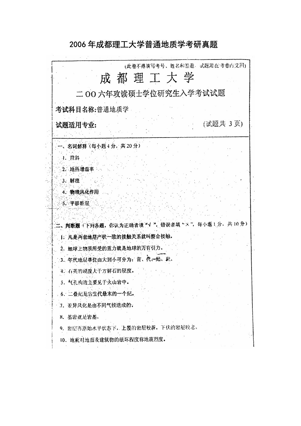 成都理工大学2014-2004普通地质学考研试题真题(10)