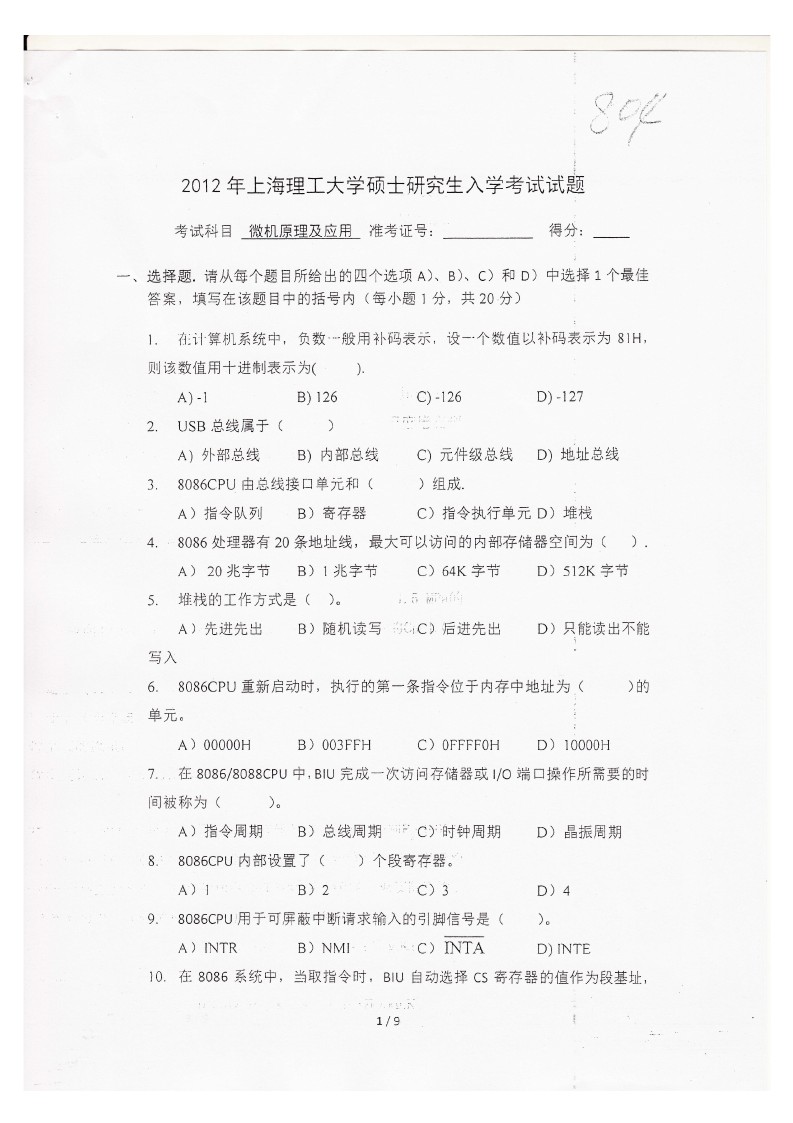 上海理工大学单片机原理及运用2007,2010-2014考研真题汇编(23)