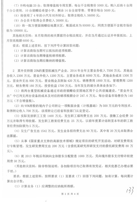 名词解释(4分一个,共5个) 滑准税 虚开发票 税务行政处罚 税负转嫁 抵免法 简答题(9分一个,共5个) 企业所得税中不征税与免税收入内容 企业所得税种不计提折旧情况 增值税视同销售情况 居民个人与非居民个人 税收保全措施的条件和内容等 计算题(10分 10 15 15共4题) 1.增值税计算,最后一小问涉及消费税 ...