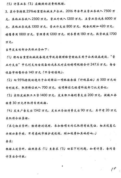 名词解释(4分一个,共5个) 滑准税 虚开发票 税务行政处罚 税负转嫁 抵免法 简答题(9分一个,共5个) 企业所得税中不征税与免税收入内容 企业所得税种不计提折旧情况 增值税视同销售情况 居民个人与非居民个人 税收保全措施的条件和内容等 计算题(10分 10 15 15共4题) 1.增值税计算,最后一小问涉及消费税 ...