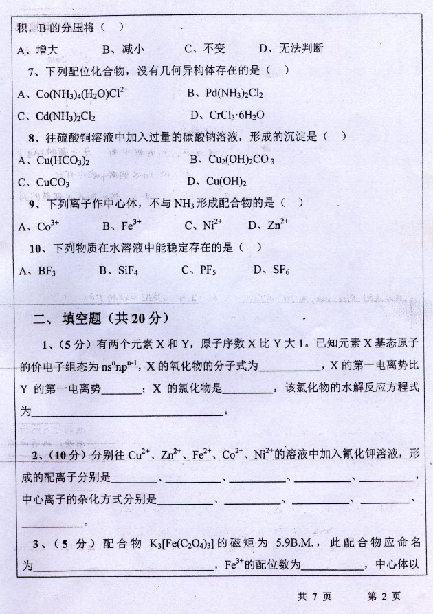 武汉大学2011-2010无机化学和有机化学636考研真题(10)