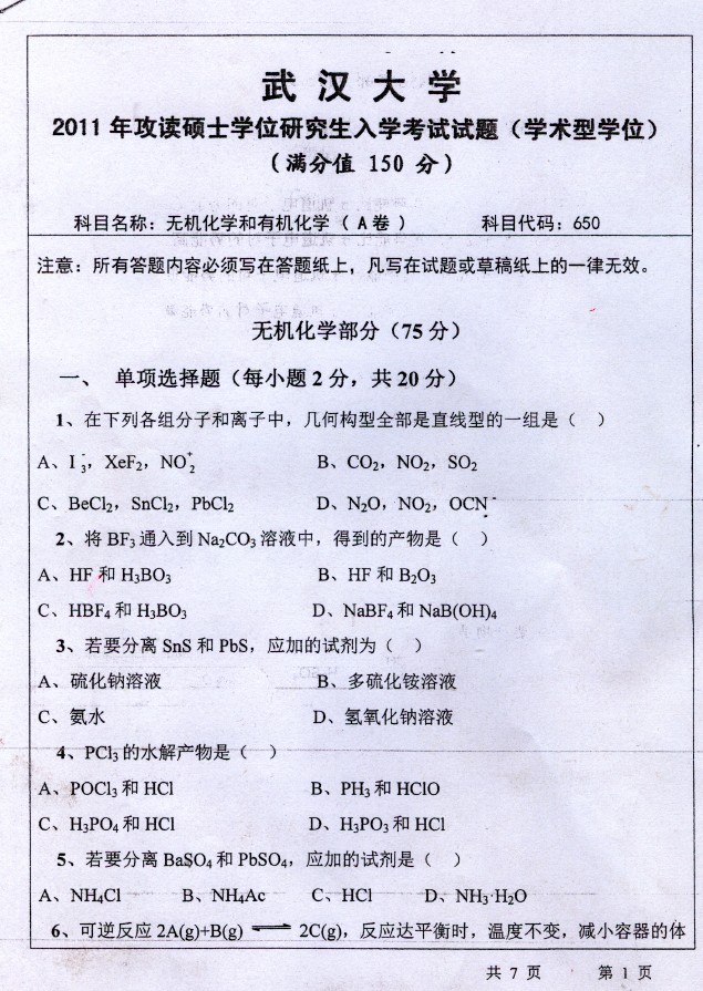 武汉大学2011-2010无机化学和有机化学636考研真题(9)