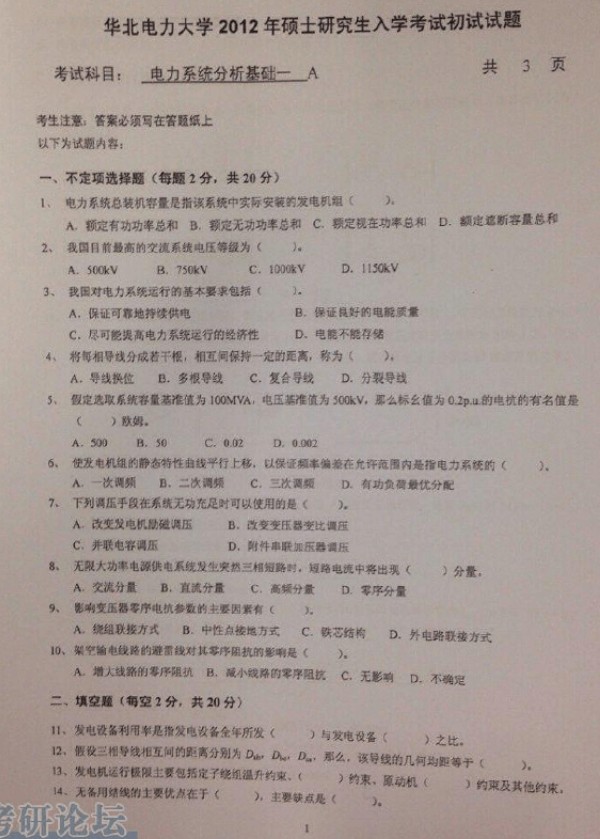2011-2013年华北电力大学(北京)电力系统分析基础一考研初试真题(5)