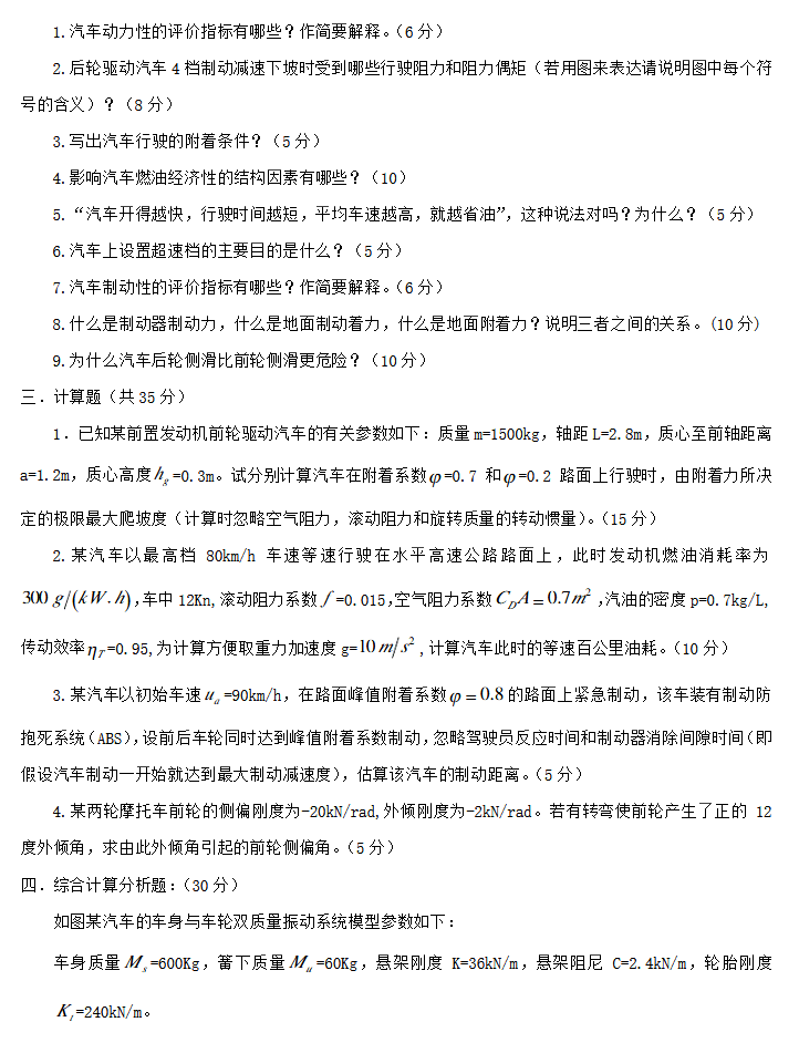重庆大学2010-2001研究生汽车理论真题题库(8)