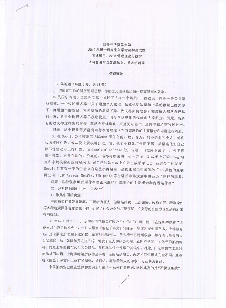 对外经济贸易大学考博真题2007-2017年 管理学基础2202或2203(33)