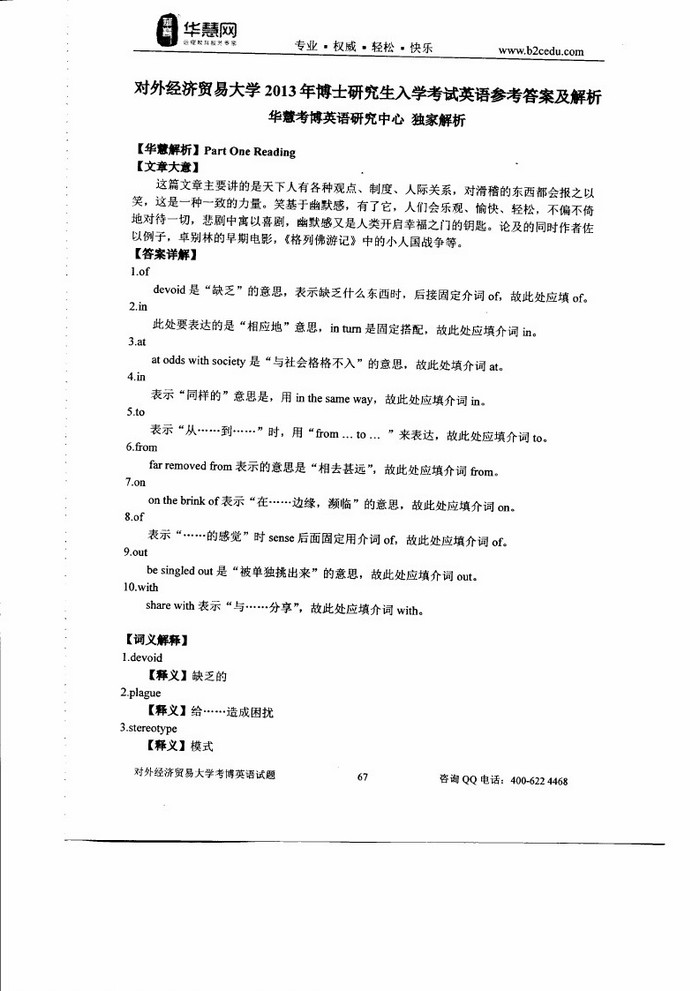 • 对外经济贸易大学2009-2014考博英语真题和答案详解