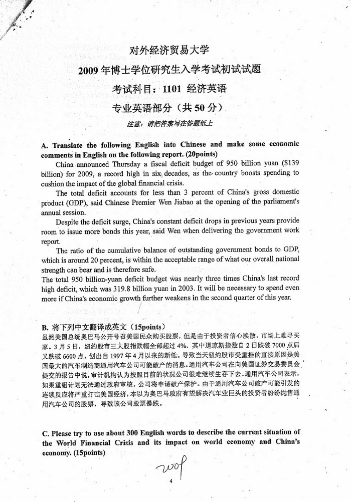 • 对外经济贸易大学2009-2014考博英语真题和答案详解