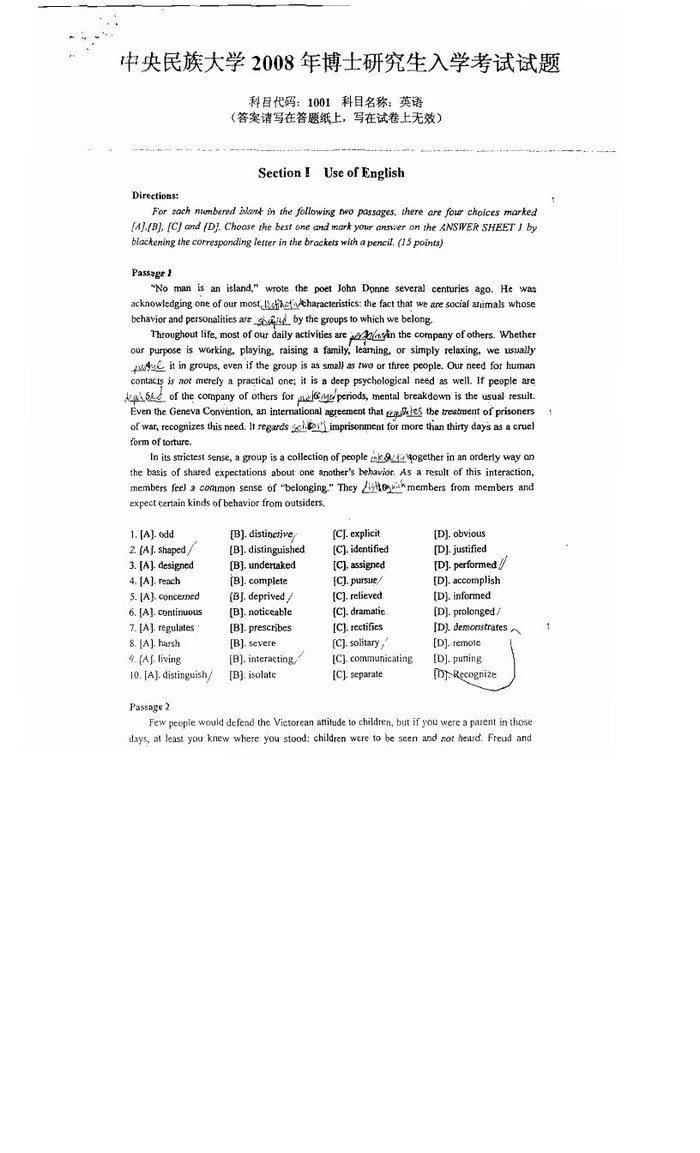 中央民族大学考博真题英语2005-2008真题2011题型(40)