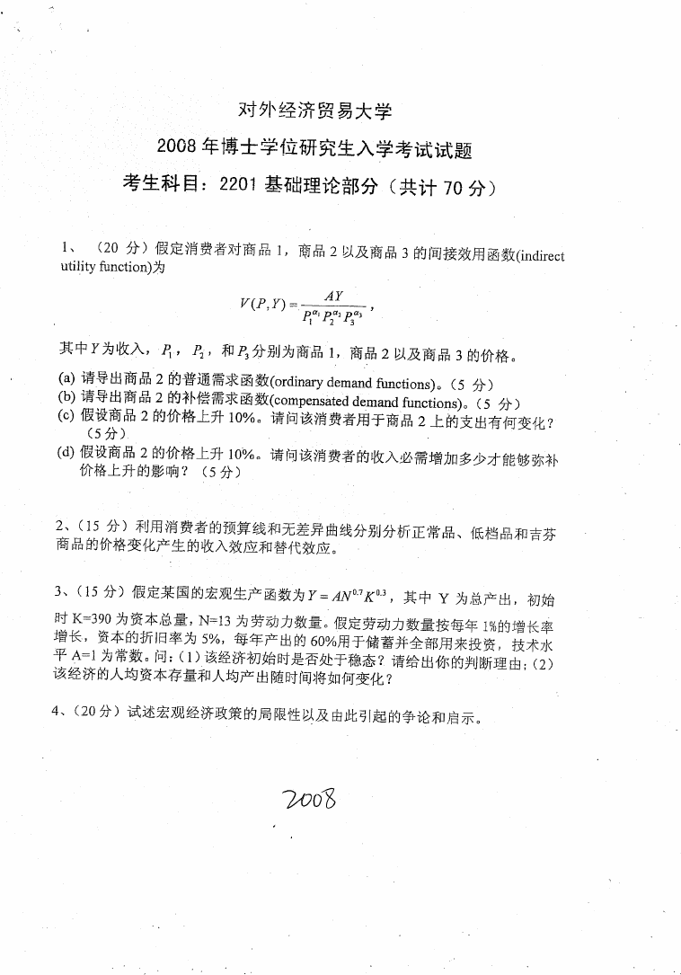 对外经济贸易大学2017,2015-2004经济学基础与数学考博真题(11)