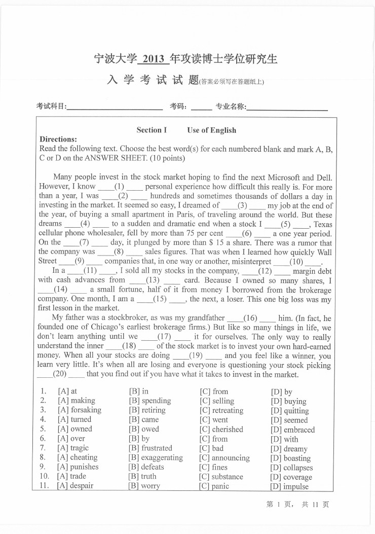 2016年北京外国语大学博士生英语入学考试试题 PartⅠ Structure and Written Expression (40%) Section A Directions: In this section, there are 15 incomplete sentences. Under each sentence, you will see four words or phrases, marked A, B, C and D. Choose the one word or phrase that completes the ...