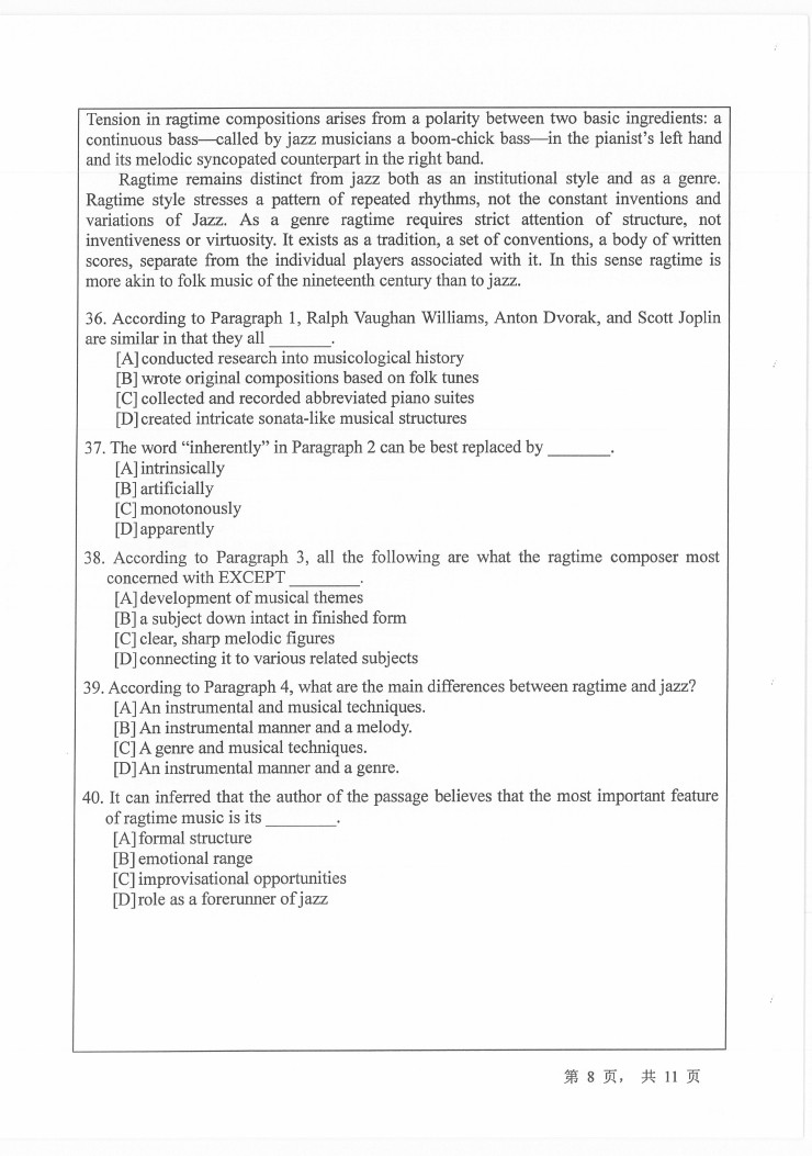 ㈠基础英语: 20个单选,几乎都是词汇辨析,难度适中,撑死专八难度,比如说euphoria/rapture,customary/cumstom/accustomed 完形填空(20个) 2篇阅读,专八难度 一段英译汉 一段汉译英 作文 北大学生毕业后选择卖猪肉,有人认为他这么做是浪费了他在名校所享受到的资源,有人支持他的选择。你的看法 ㈡大综合: ● ...