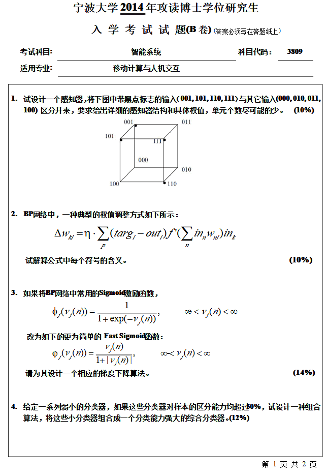 2013-2015年宁波大学3809智能系统A考博真题(4)