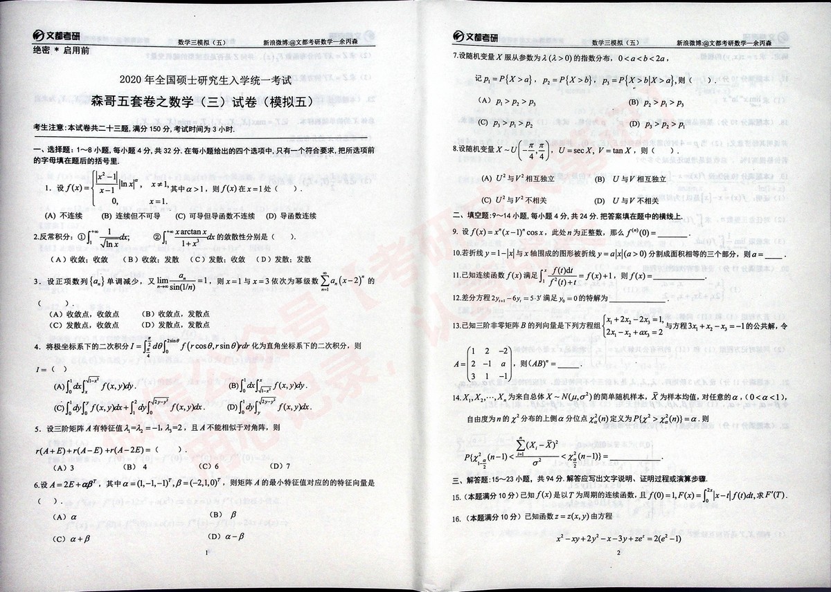 2020合工大森哥五套卷习题与答案考研数学三(9)