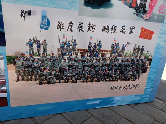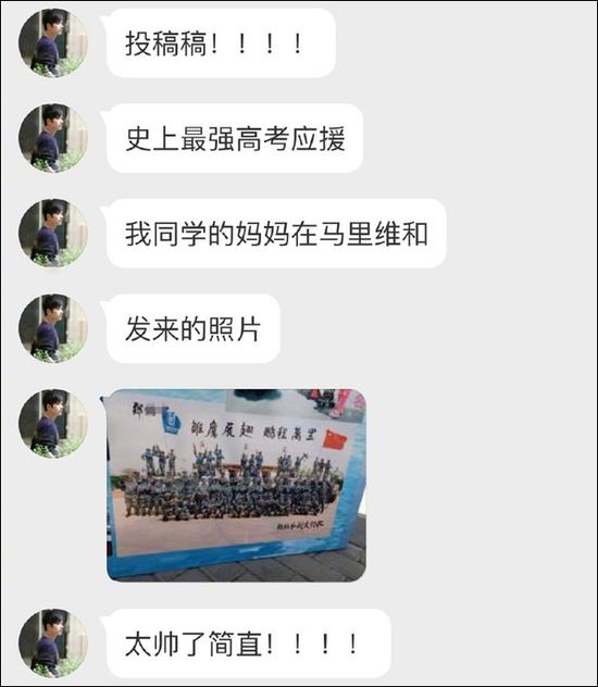 投稿人称自己的高三同学郑某,在高考前夕,收到了一份特殊的“高考应援礼物”——一张中国维和部队的合影。