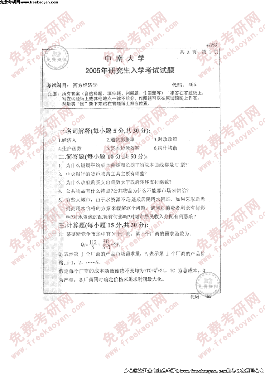 中南大学2005年硕士研究生入学考试西方经济学