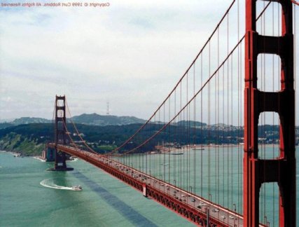 The orange towers of the Golden Gate Bridge – probably the most beautiful, certainly the most photographed bridge in the world – are visible from almost every point of elevation in San Francisco. The only cleft in Northern California's 600-mile continental wall, for years this mile-wide strait was considered unbridgeable. As much an architectural as an engineering feat, the Golden Gate took only 52 months to design and build, and was opened in 1937. Designed by Joseph Strauss, it was the first really massive suspension bridge, with a span of 4200ft, and until 1959 ranked as the world's longest. It connects the city at its northwesterly point on the peninsula to Marin County and Northern California, rendering the hitherto essential ferry crossing redundant, and was designed to withstand winds of up to a hundred miles an hour and to swing as much as 27ft. Handsome on a clear day, the bridge takes on an eerie quality when the thick white fogs pour in and hide it almost completely.