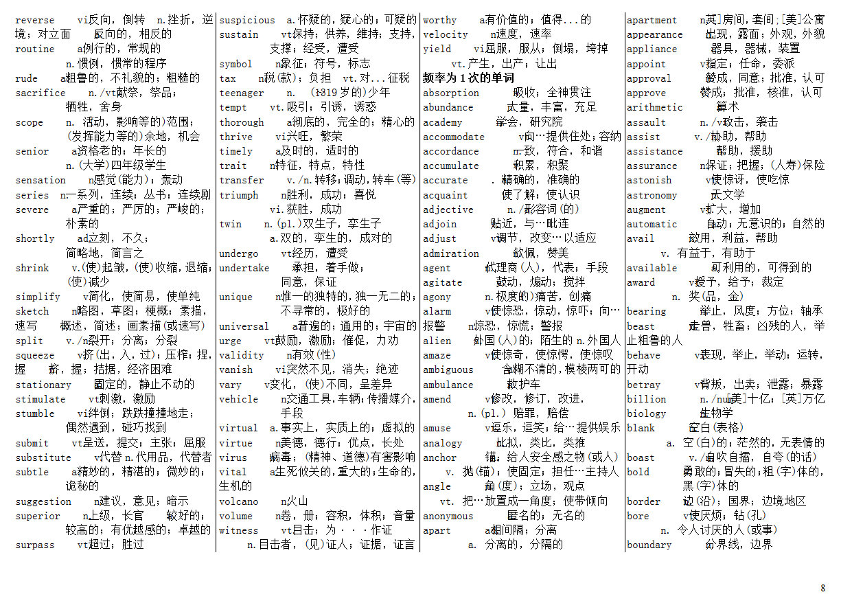 考研英语高频词汇 频率在 100 次以上的词汇 part n.部分;角色;作用;零件v.使分开,分离,分别 pass v.经过,走过;传递;通过(考试等)n.通行证,护照;关口 tie n.领带,领结;联系,关系;约束,束缚v.系,栓,捆 passage n.通过;通路;段,节 even ad.甚至,即使a.平坦的;偶数的;均匀的 cause n.原因;事 ...